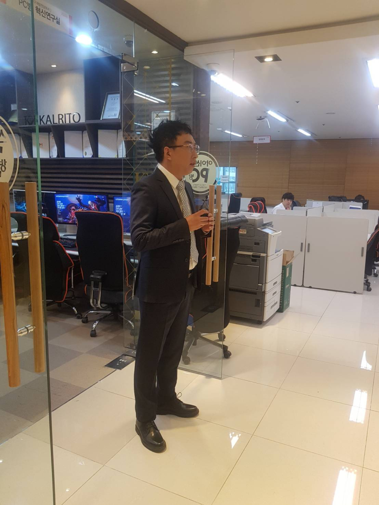 본사에 있는 게임환경연구소에 대해서 설명도 해주시고, 특허출원한 제품에 대해서 설명도 해주셨답니다 아이센스리그PC방에 인기 개그맨 박명수씨가 직접 본사를 방문해서 각 부서를 돌아다니며 본사 직원들과 인터뷰도 하며, 부서를 소개하는 시간도 가졌답니다:D |