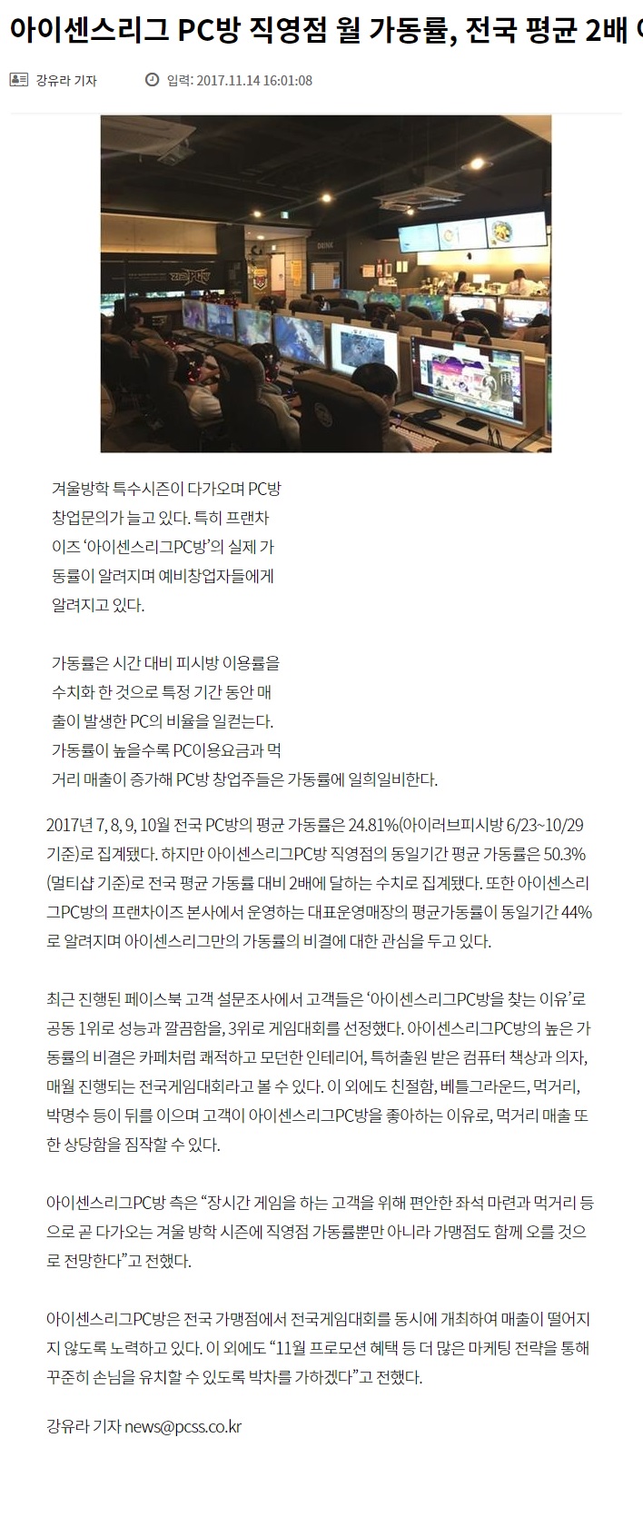 아이센스리그PC방 직영점 월 가동률, 전국 평균 2배이상!