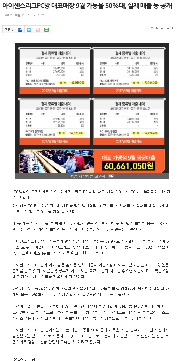 아이센스리그PC방 대표매장 9월 가동률 50%대, 실제매출 등 공개!