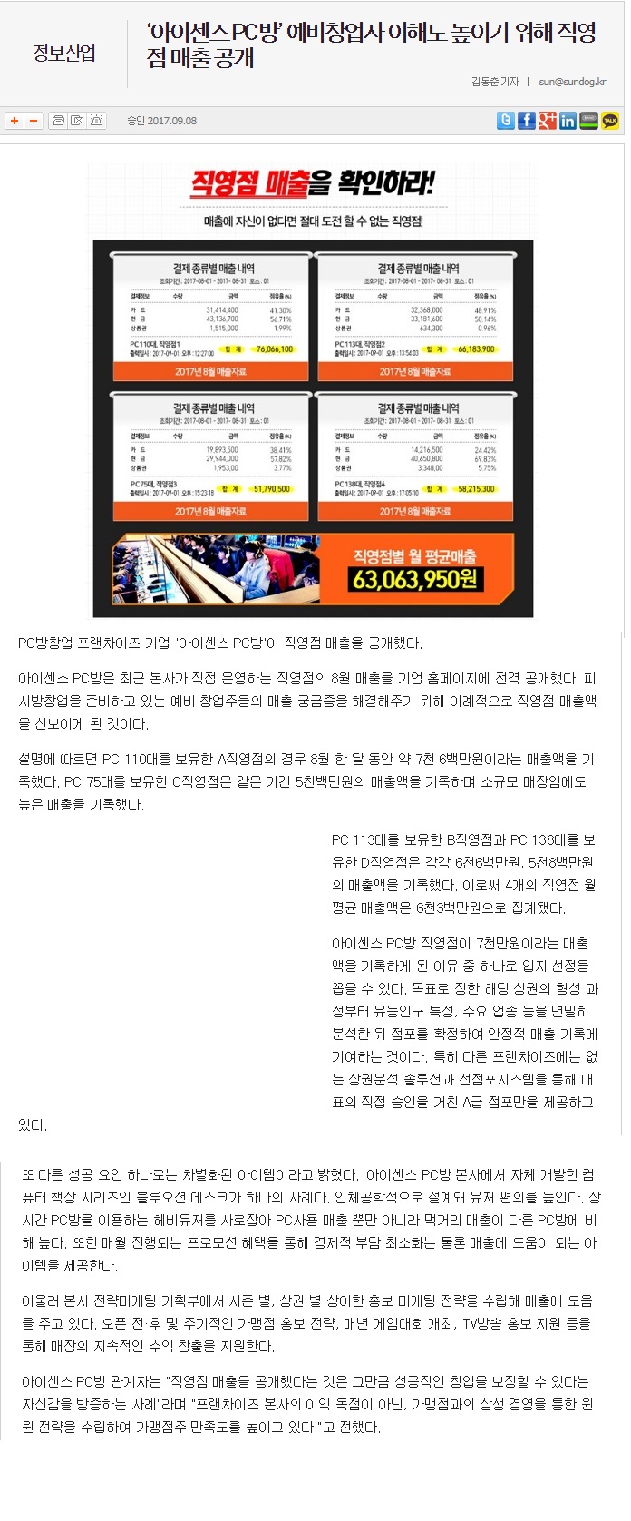 아이센스PC방 예비창업자 이해도 높이기 위해 직영점 매출 공개!