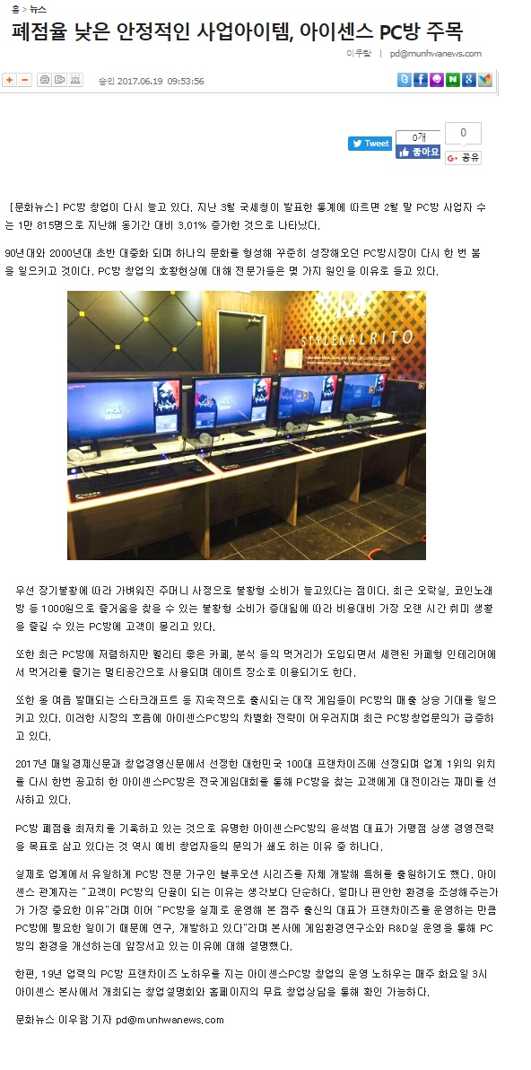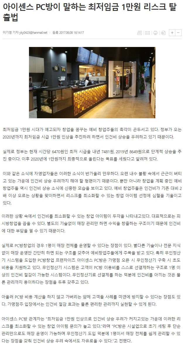 아이센스 PC방이 말하는 최저임금 1만원 리스크 탈출법