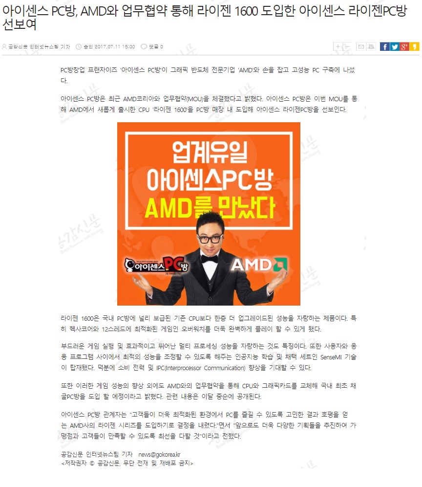 아이센스PC방, AMD와 업무협약 통해 라이젠1600 도입한 아이센스 라이젠PC방 선보여