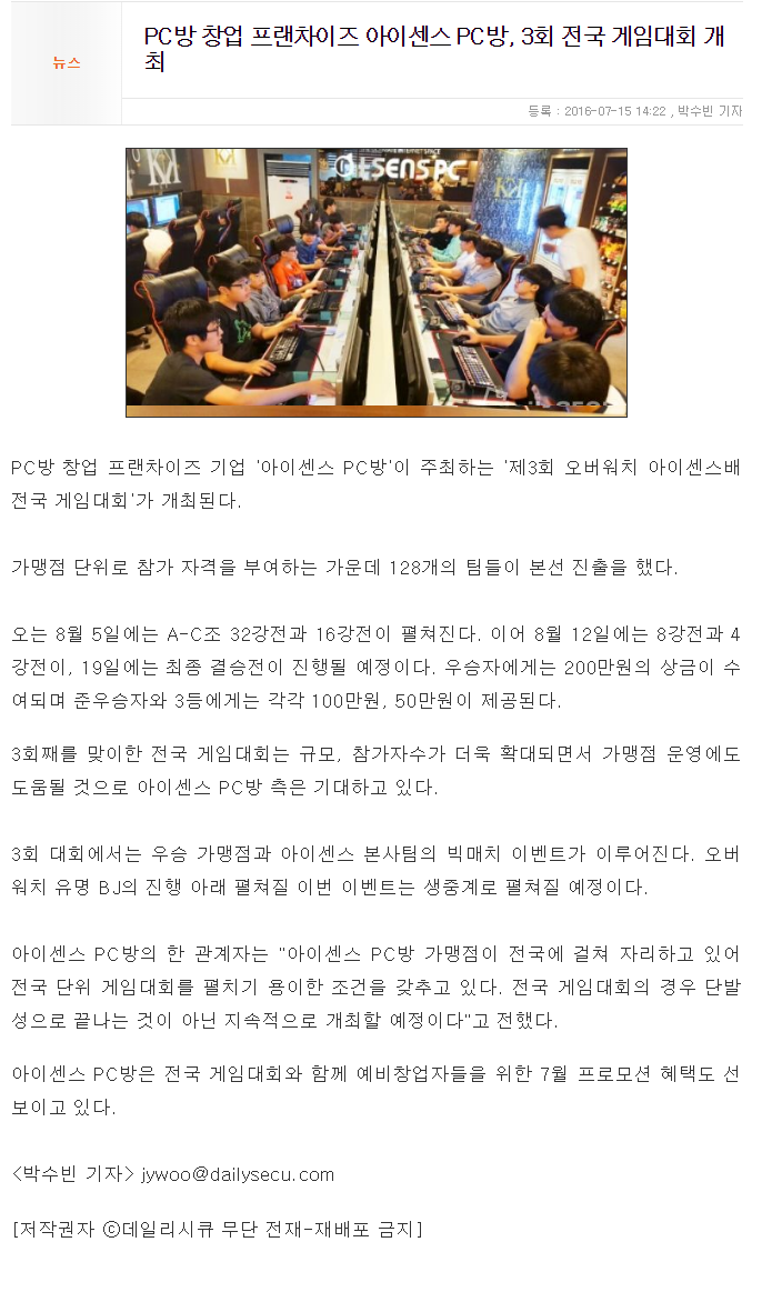 PC방 창업 프랜차이즈 아이센스 PC방, 3회 전국 게임대회 개최