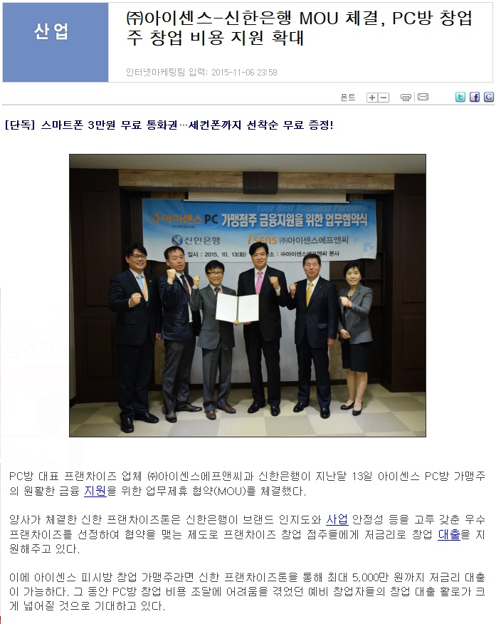 ㈜아이센스-신한은행 MOU 체결, PC방 창업주 창업 비용 지원 확대